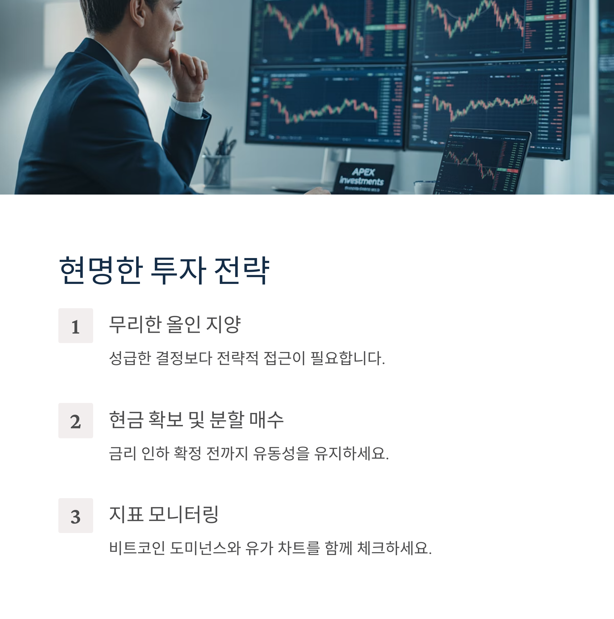 - 금리 인하 확정 전까지는 현금 확보 및 분할 매수 전략