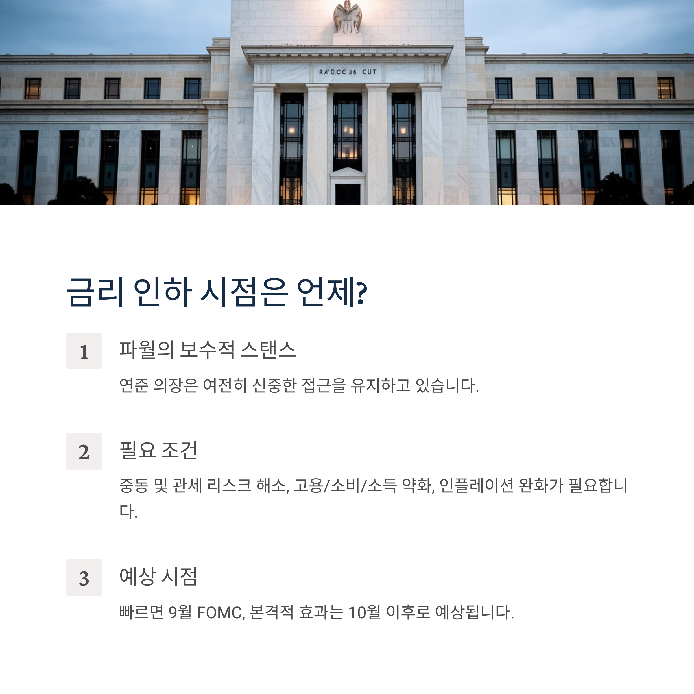 이러한 조건들이 충족되었을 때, FOMC가 금리 인하를 단행할 수 있으며, 그 시점은 빠르면 9월 FOMC, 본격적인 효과는 10월 이후가 될 것으로 예상됩니다.